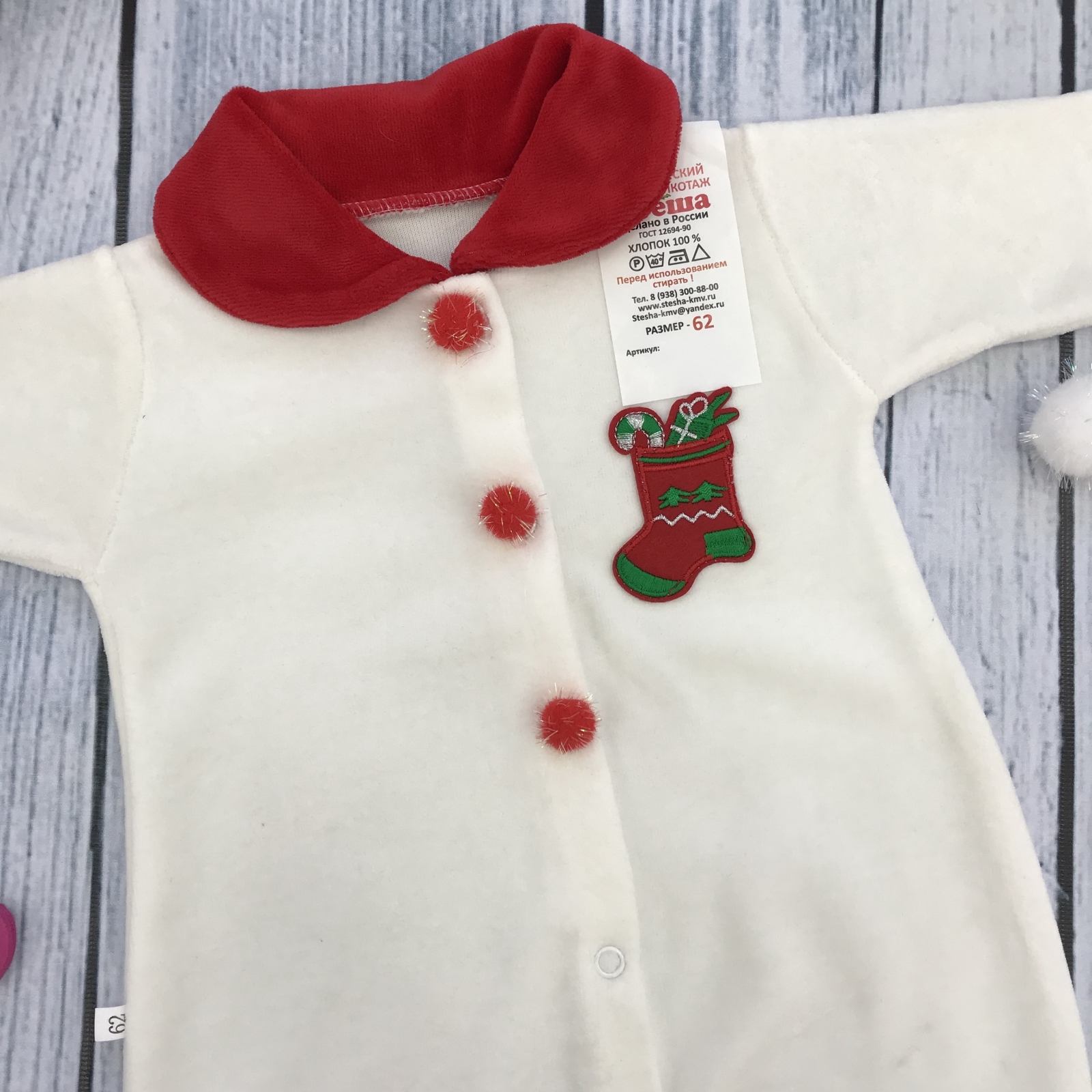 Теги: Купить оптом новогодний комбинезон от производителя. 244. Комбинезон Санта, хлопок 80% велюр 20% ПЭ, молочный 56,62,68 цена,отзывы официальный сайт "Стеша Нальчик"