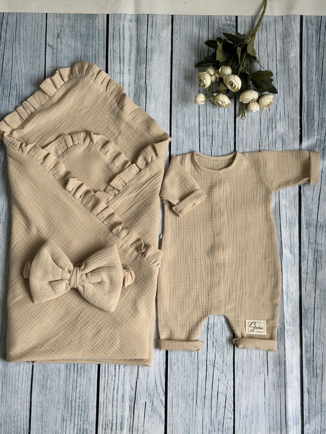 Теги: Купить детские конверты, комбинезон оптом, детские конверты на выписку оптом. 335-К. Комплект из детского комбинезона, р 56 и конверта муслин, хлопок 100% 90/90 см, кофейный цена,отзывы официальный сайт "Стеша Нальчик"
