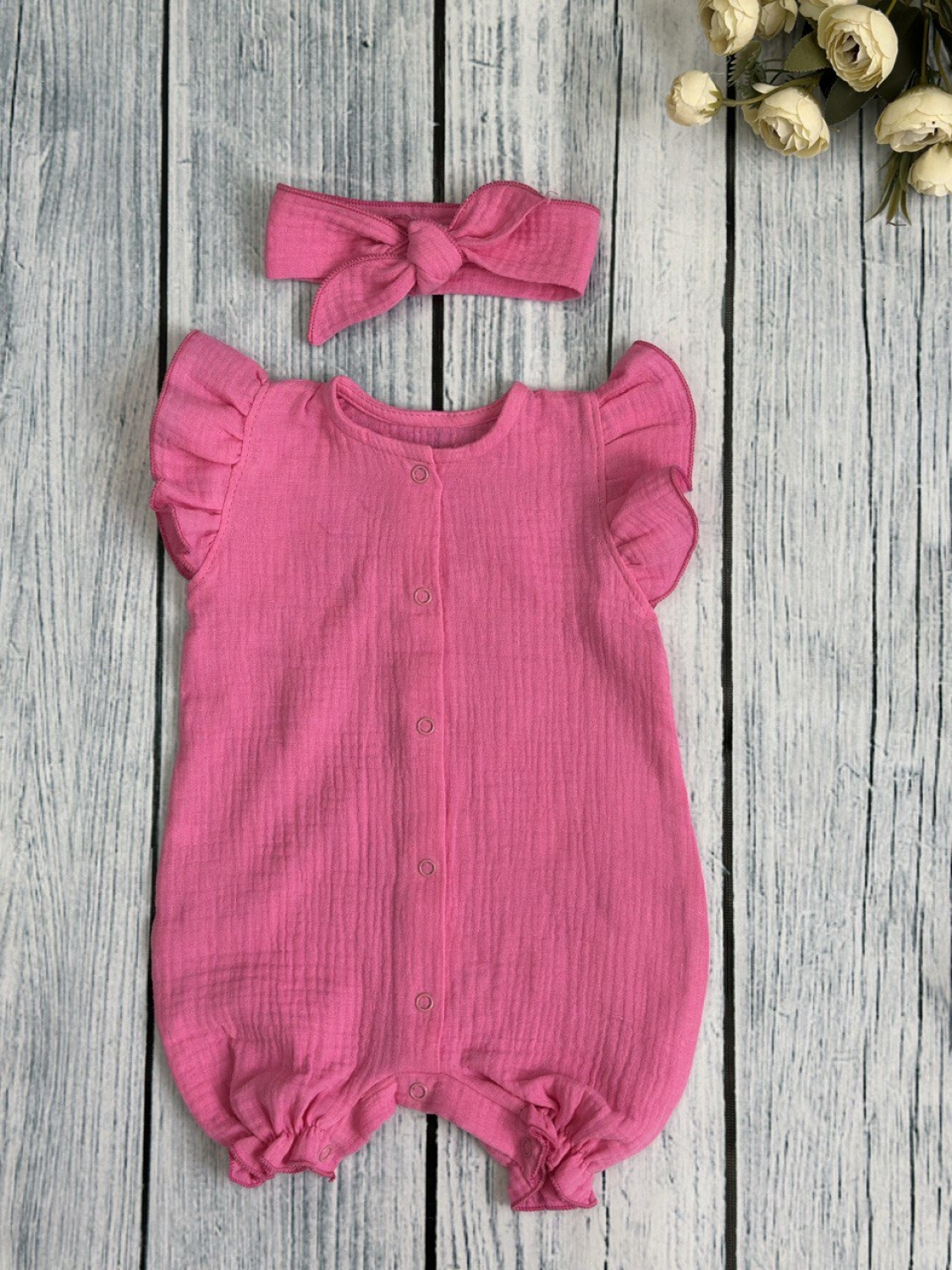 Купить оптом 341-Ф. Песочник с повязкой для девочки из муслина, хлопок 100%, р 62,68,74,80 фуксия в Нальчике